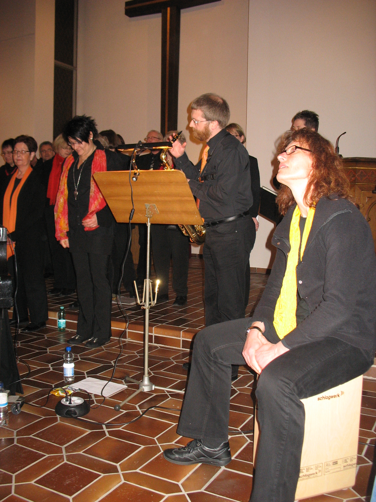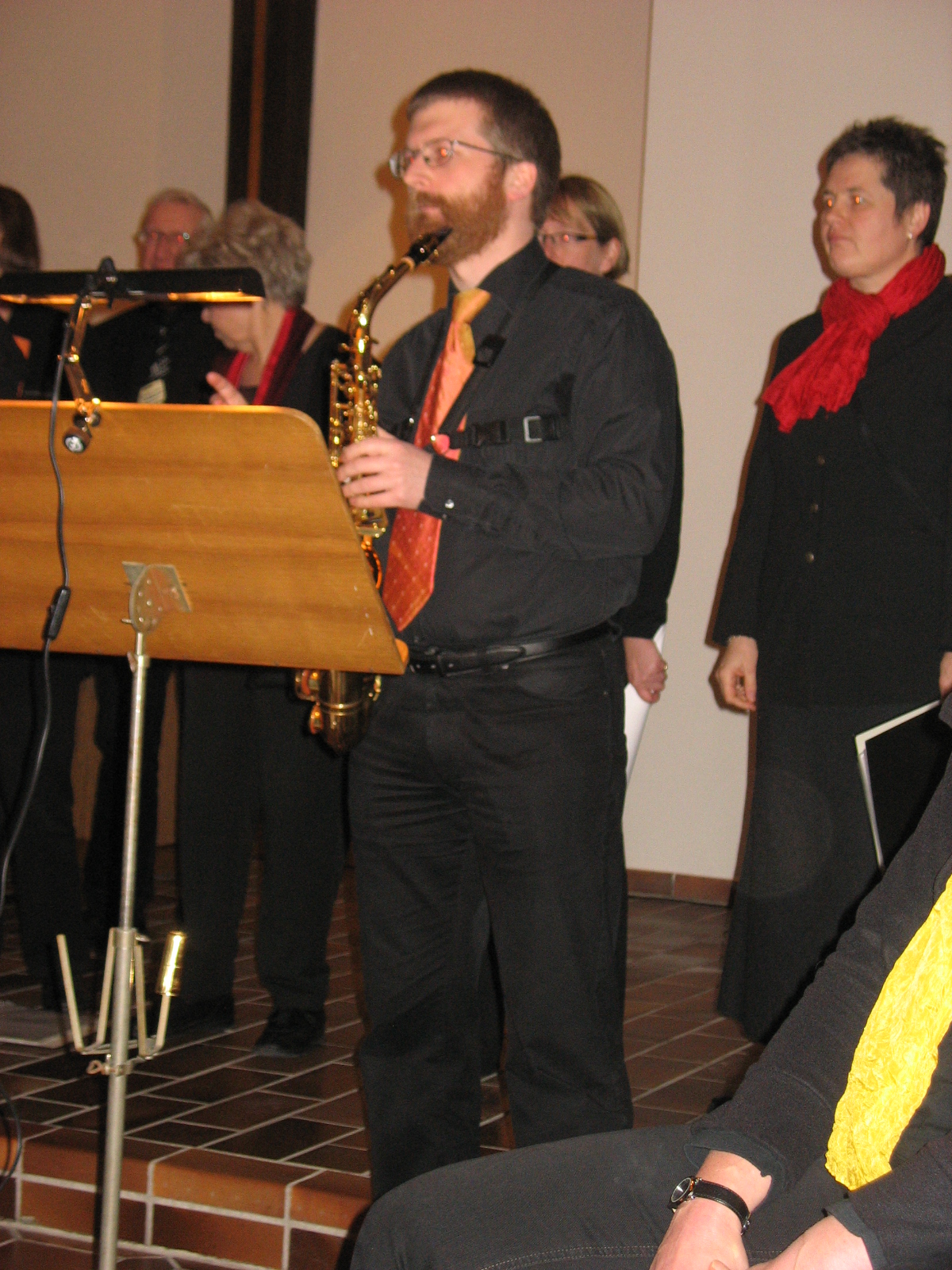 Danach folgte ein Saxophonsolo von Arne, bei dem er von Ute am Klavier begleitet wurden. Es war ein Medley aus bekannten Gospels wie „Oh When The Saints“, „Joshua Fit The Battle of Jericho“ oder “Amen”. Sowohl der Chor als auch die Zuschauer summten, klatschten, sangen, tanzten und schnipsten begeistert mit. Arnes Beitrag war total fetzig und lockerte die Stimmung richtig auf – die Kirche tobte und es gab johlenden Beifall!