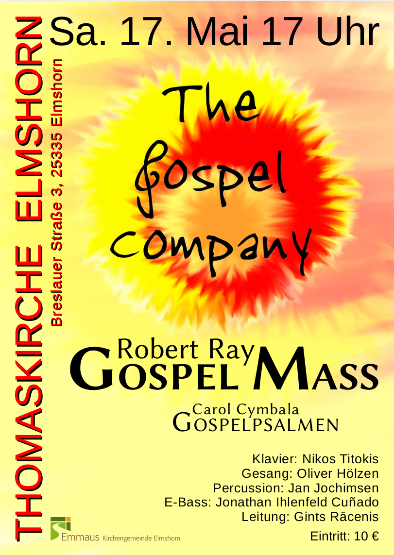 Zu hören sind diese spannende Musikstücke am 17. Mai 2025 um 17.00 Uhr in der Thomaskirche der Emmaus-Kirchengemeinde (Breslauer Str. 3). Die vortragende Gospel Company unter Leitung von Gints Racenis begrüßt als mitwirkende Gäste aus der Hamburger Jazz-Szene: Oliver Hölzen (Gesang), Nikos Titokis (Klavier), Jan Jochimsen (Percussion) und Jonathan Ihlenfeld Cuñado (E-Bass) und freut sich über zahlreiche gut gelaunte Zuhörer. Und wer zu Beginn des Konzertes doch noch schwermütigen Gedanken nachhängt, wird spätestens mit dem Schlusston ein Lächeln auf den Lippen haben.